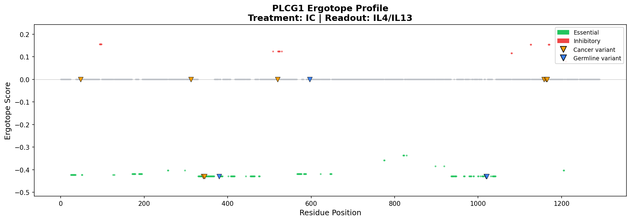 Ergotope scores along the protein sequence. Negative scores (green) = essential for function, Positive scores (red) = inhibitory. Markers indicate disease variants: cancer / germline.